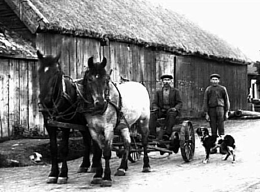 FAR OCH SON PÅ VÄG TILL SLÅTTERN MED PARHÄSTAR OCH SLÅTTERMASKIN.
