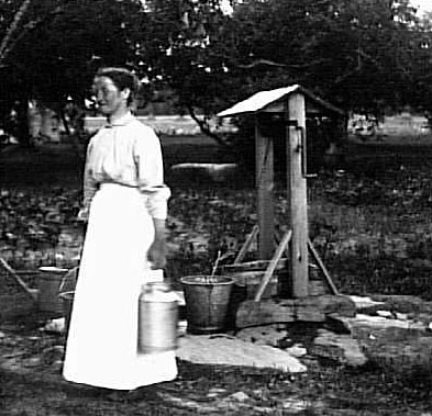 EN KVINNA GÅR FRÅN BRUNNEN MED VATTENKÄRL I HANDEN, ÖVER BRUNNEN EN BRUNSVINSCH.