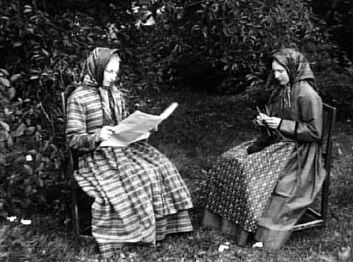 TVÅ KVINNOR SITTER I TRÄDGÅRDEN, EN LÄSER OCH EN HANDARBETAR.