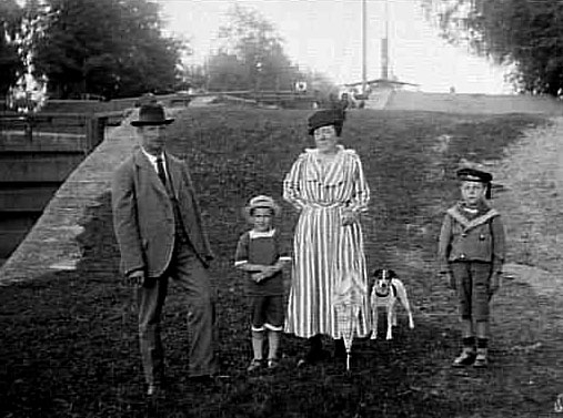 FAMILJ MED HUND SOM STÅR VID SLUSSEN. ETT AV BARNEN ÄR KLÄTT I SJÖMANSKOSTYM.