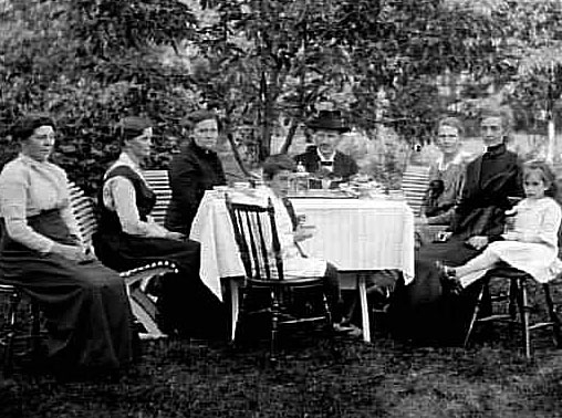 EN FAMILJ SOM DRICKER KAFFE I TRÄDGÅRDEN.