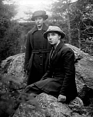 TVÅ KVINNOR I SKOGEN SITTANDE BLAND STORA STENAR