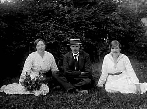 EN MAN OCH TVÅ KVINNOR I GRÖNGRÄSET.