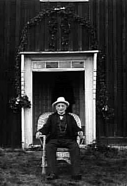 EN MAN PÅ SIN 80-ÅRSDAG. BAKOM SIG HAR HAN EN BLOMSTERDEKORATION OVANFÖR DÖRREN.