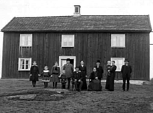 SLÄKTGRUPP FRAMFÖR ETT TVÅVÅNINGS BOSTADSHUS I TRÄ.