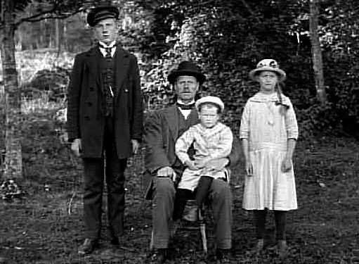 EN MAN OCH TRE BARN UTE I TRÄDGÅRDEN.