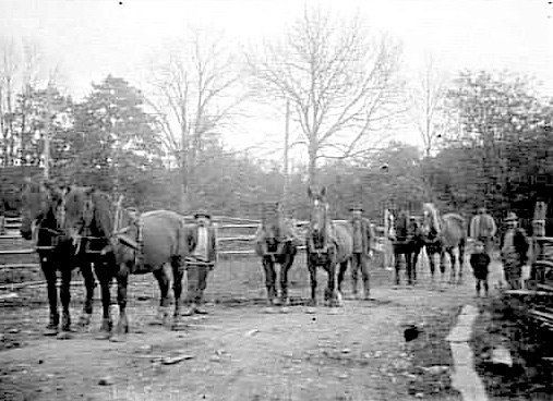 FYRA MÄN OCH ETT BARN MED TRE PAR HÄSTAR PÅ EN MARKVÄG