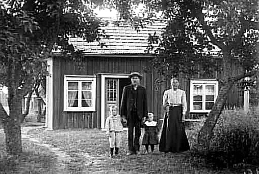 FAMILJ STÅENDE I TRÄDGÅRDEN FRAMFÖR BOSTADSHUSET