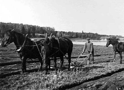 EN MAN PLÖJER EN ÅKER MED TVÅ HÄSTAR, FJOLÅRSFÖLET GÅR LÖST PÅ ÅKERN.