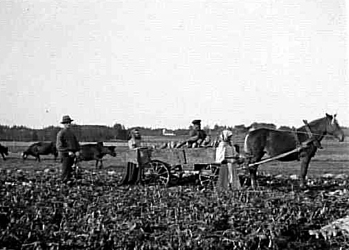 ETT SKÖRDELAG SOM TAR UPP ROTFRUKTER PÅ GÄRDET TILL (FÄGRE PRÄSTGÅRD?).