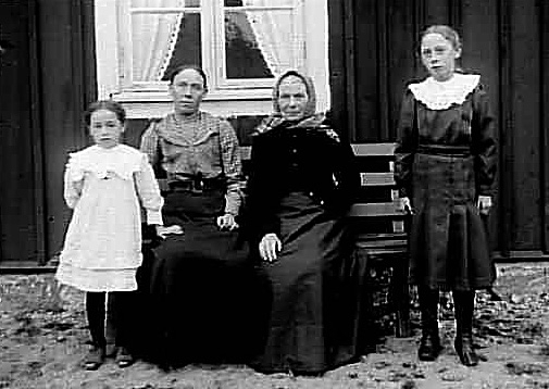 TVÅ KVINNOR OCH TVÅ BARN VID EN HUSVÄGG