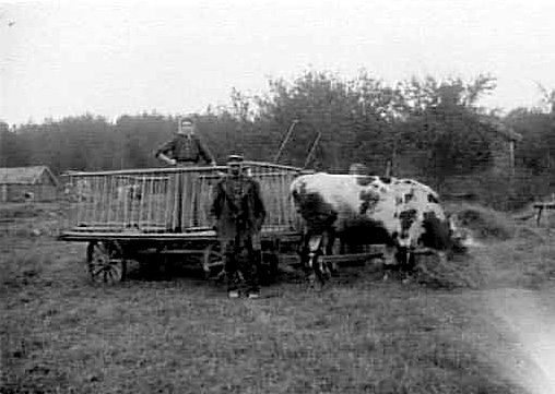 EN MAN OCH TVÅ KVINNOR IFÄRD MED SKÖRDEARBETE. TVÅ OXAR ANSPÄNDA FRAMFÖR EN VAGN MED VADSBOKORGE.