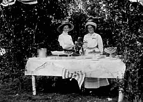 TVÅ KVINNOR STÅR VID ETT BORD OCH SÄLJER KAFFEDOPP.