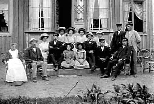 FESTKOMMITTÉN I FREDSBERGS BLÅBANDFÖRENING SAMLAD UTANFÖR ETT HUS.