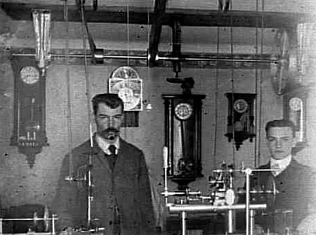 TVÅ MÄN I EN URMAKAREVERKSTAD.