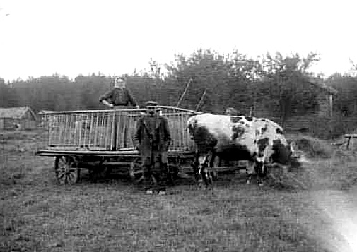 EN MAN OCH TVÅ KVINNOR IFÄRD MED SKÖRDEARBETE. TVÅ OXAR ANSPÄNDA FRAMFÖR EN VAGN MED VADSBOKORGE.