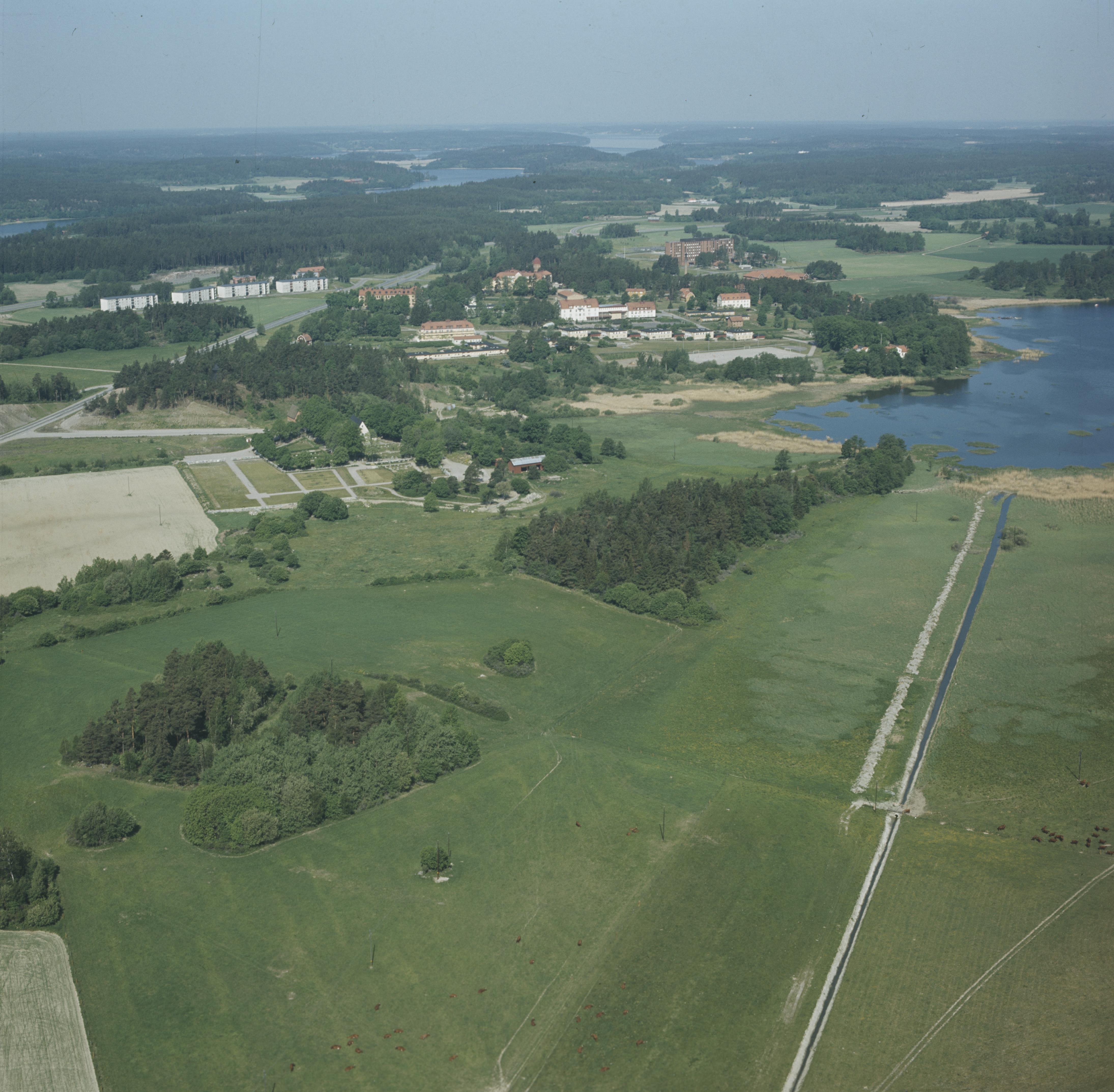 Till vänster Hammarby kyrka, till höger sjön Fysingen från sydöst. Löwenströmska sjukhuset / Löwenströmska lasarettet upptill i bildens mitt.