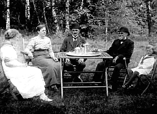 ETT BARN, TVÅ KVINNOR OCH TVÅ MÄN DRICKER KAFFE VID TRÄDGÅRDSBORDET.