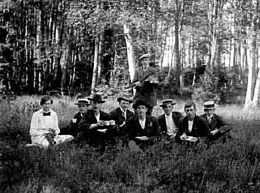 SJU MÄN OCH EN KVINNA DRICKER KAFFE I GRÄSET. EN MAN SPELAR FIOL.