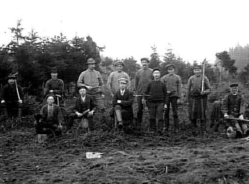 TOLV MÄN HÅLLER PÅ MED SKOGSPLANTERING.