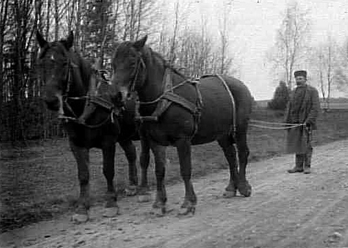 EN MAN STÅR VID VÄGEN OCH HÅLLER I TVÅ HÄSTAR.