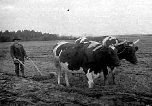 EN MAN PLÖJER MED HJÄLP AV TVÅ OXAR.