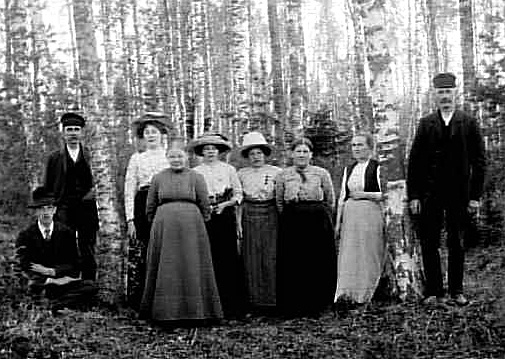 SEX KVINNOR OCH TRE MÄN I SKOGEN.