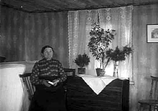EN ÄLDRE KVINNA SITTER VID ETT BORD I FINRUMMET OCH LÄSER I EN BOK.