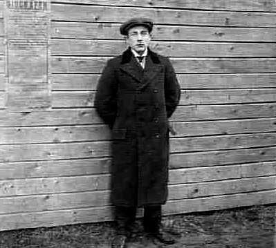EN UNG MAN STÅR VID EN HUSVÄGG, TROLIGTVIS EN BIOGRAF.