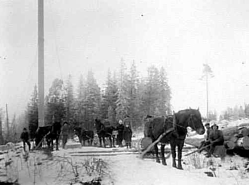 MÄN I ARBETE MED AVLASTNING AV TIMMER VID ETT UPPLÄGG FÖR TIMMERSTOCKAR.