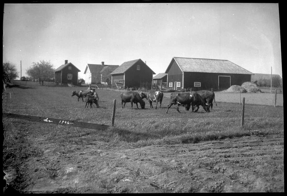 Kor på bete framför gård
