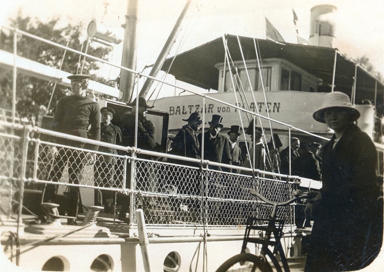 Jenny Isaksson i konfirmationshatten tittar på den kungliga båten.