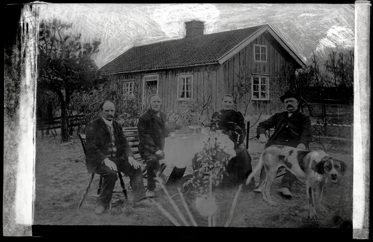 Grupp runt trädgårdsbord