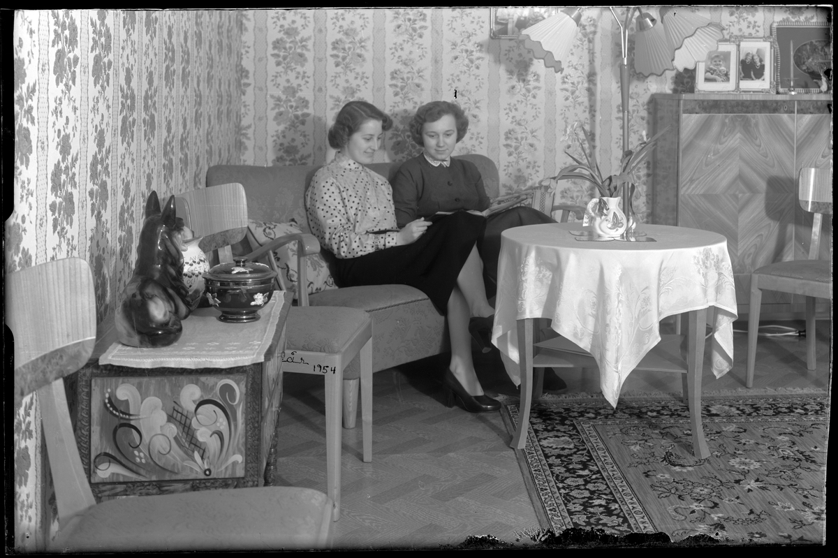 Två kvinnor läser i soffa