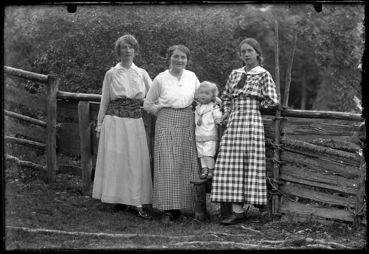 Tre unga kvinnor vid gärdesgård