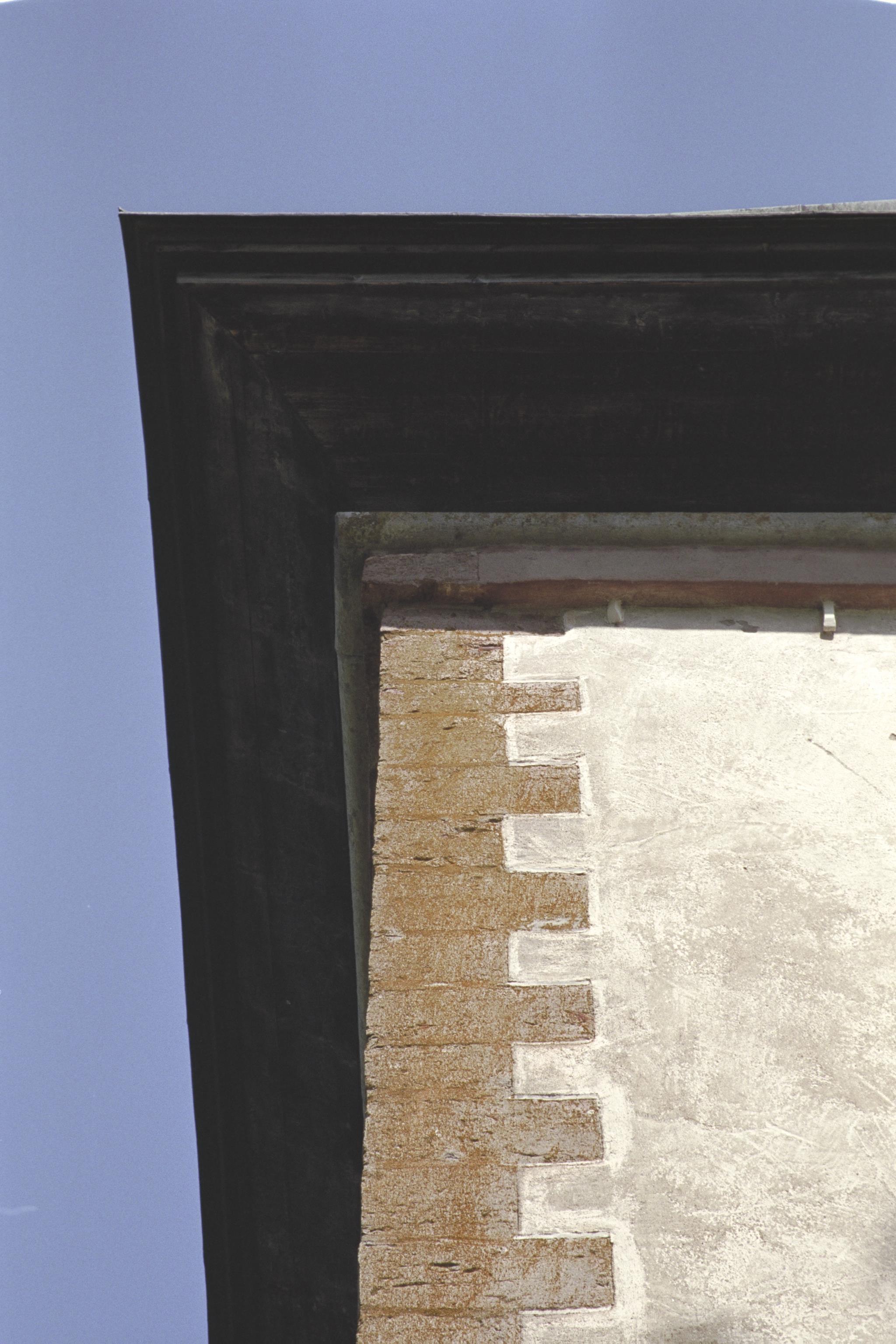Huvudbyggnadens södra gavel, vänstra hörnkedjans övre del.