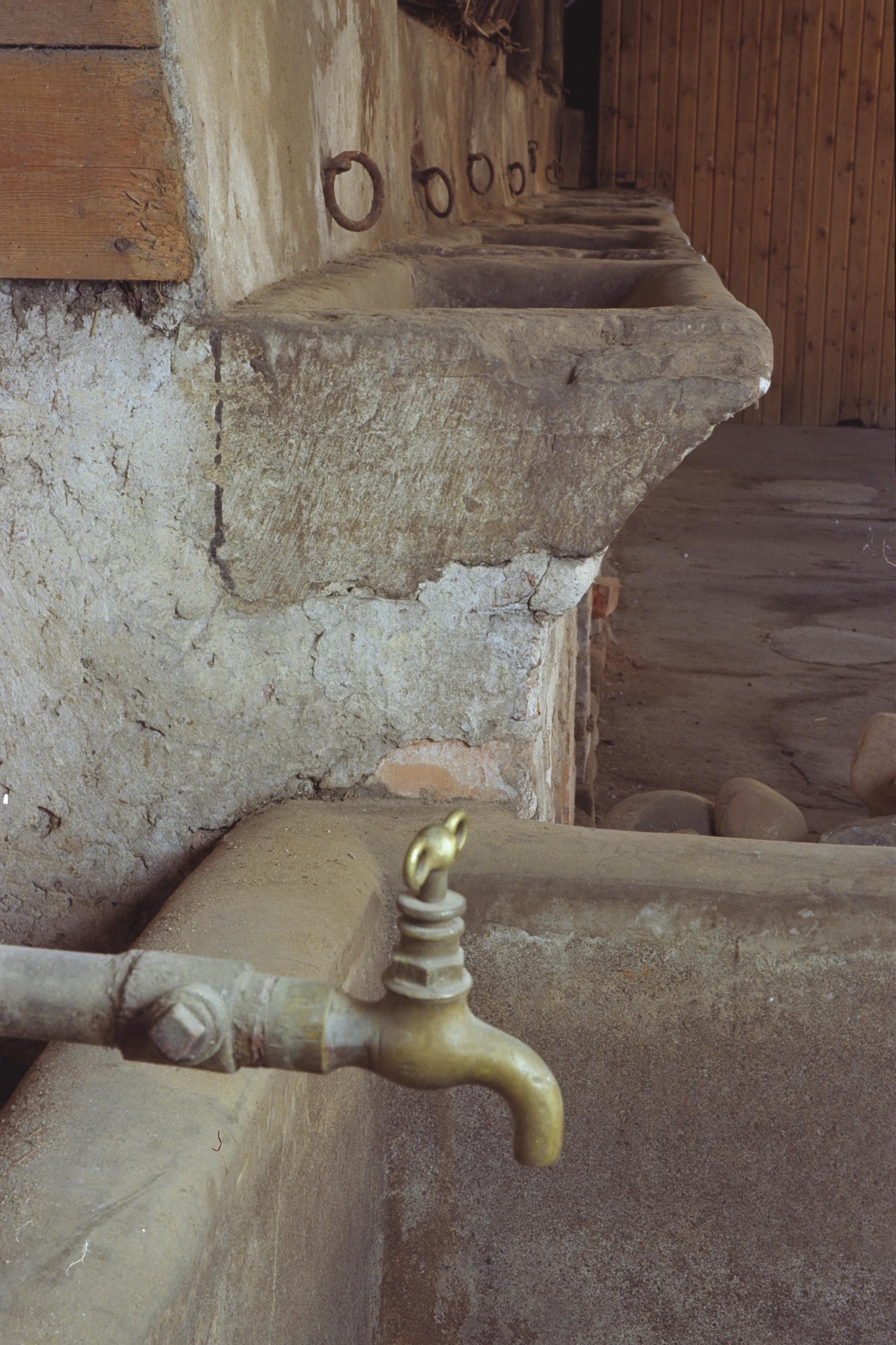 Östra stallet, vattenho och utefter väggen krubbor av sten.