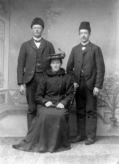 Gruppbild av två herrar och sittande kvinna.