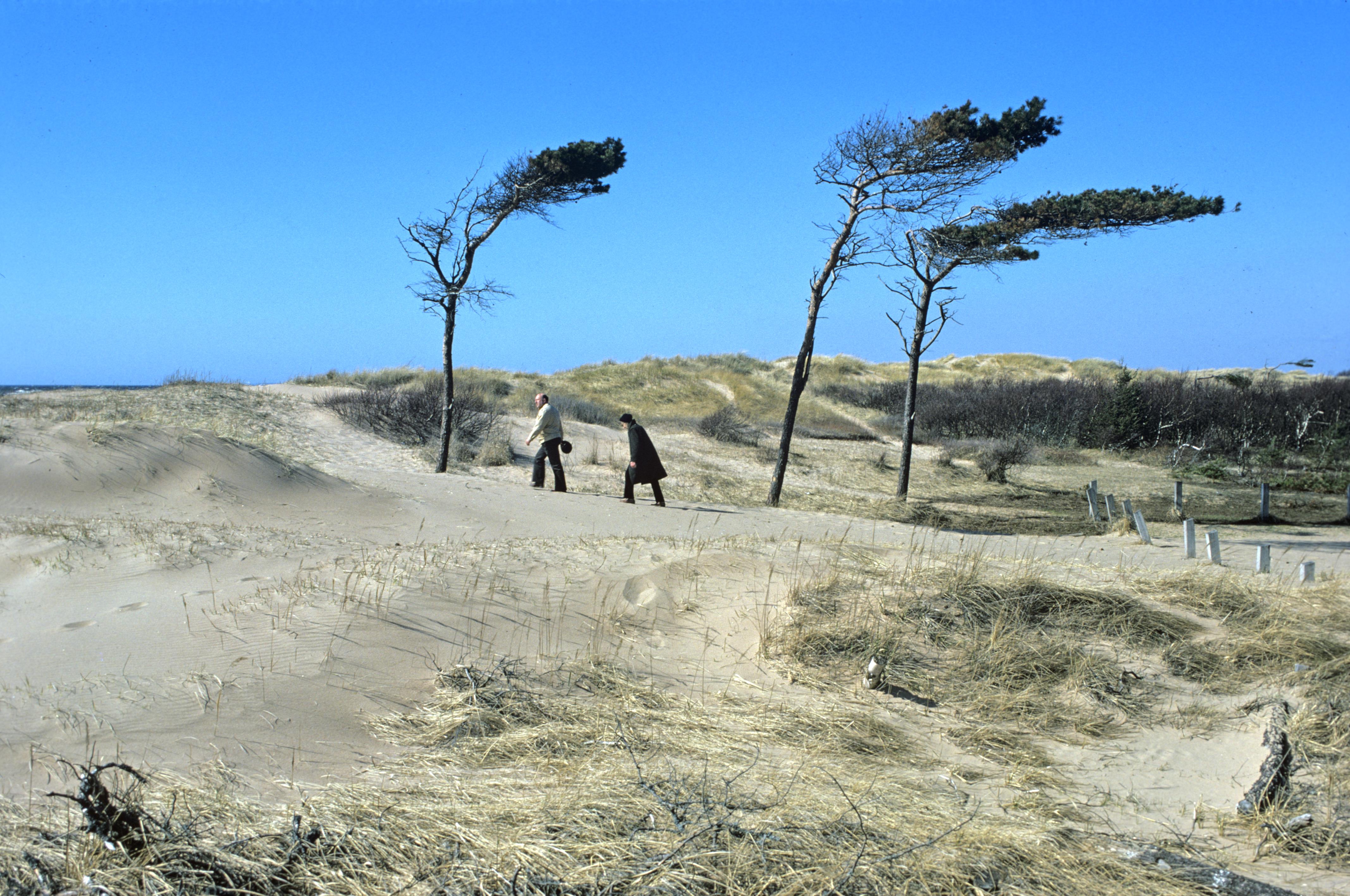 Vindpinade träd. Lagans utlopp i Laholmsbukten, cirka 20 km söder om Halmstad kallas Lagaoset. Bilden troligen från mitten av 1970-talet.
