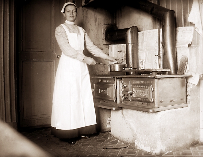 År 1900 var uppfinningen inte längre helt ny, men fotot visar säkerligen ett toppmodernt kök år 1900, med rätt arbetshöjd och allting. Så lättbetjänad, så rent, att det går alldeles utmärkt att ha en snövit, nypressad, stärkt arbetsklädsel.