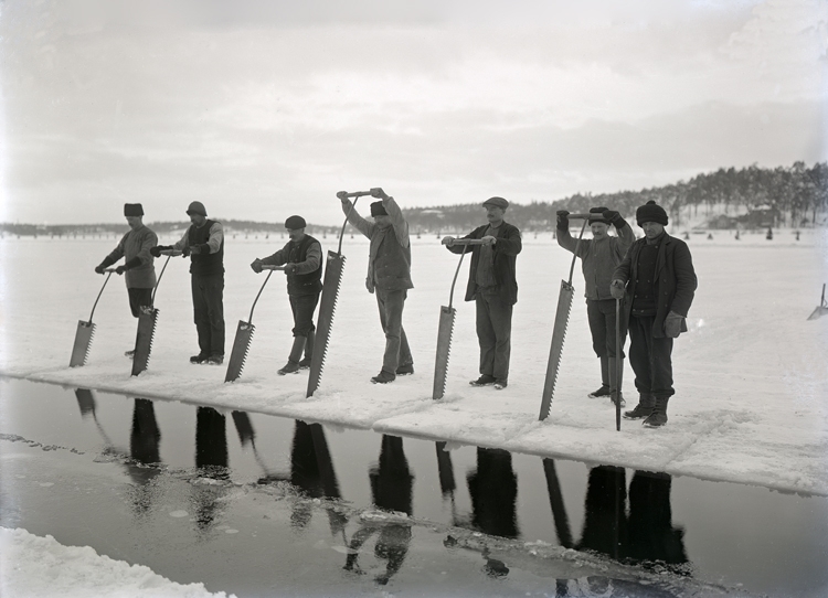 Några män sågar upp is med issåg.