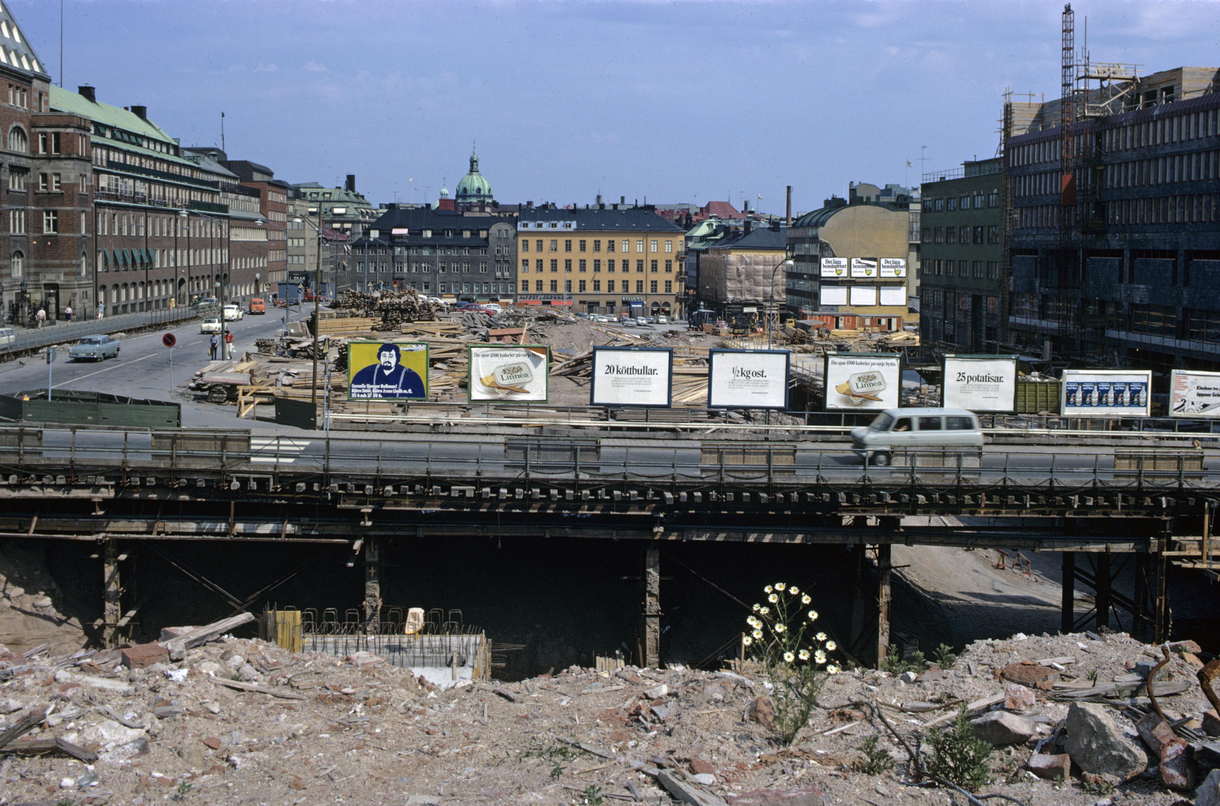 "Gropen", område med byggnadsarbeten på Nedre Norrmalm (Gamla Klarakvarteren). Bilden troligen från början av 1970-talet.