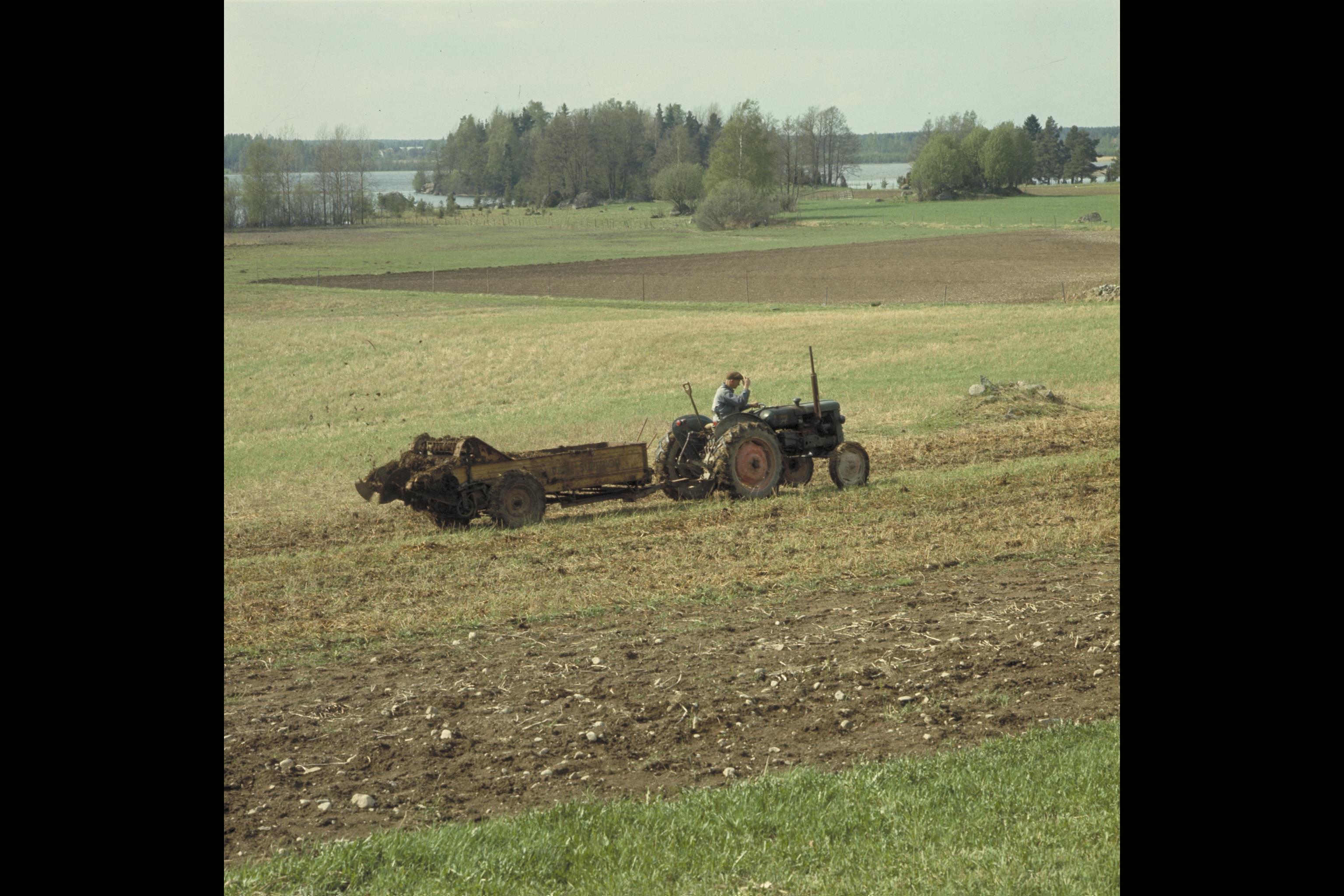 Gödsling av åker. Bilden troligen från mitten av 1960-talet.