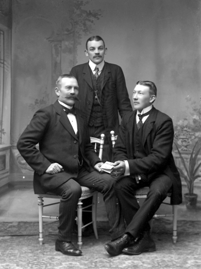 Till vänster, okänd. Gustav "Sme-Lars" Larsson, *1885, död 1962, Gullspång. Till höger målarmästare Hjalmar Wahlberg, *1884, död 1969.