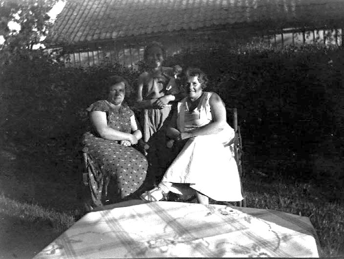Fr.v. Fru Beda Johansson, gift med Emil Johansson som så småningom blev brandchef i Skara. I mitten Barbro, gift Ramberg, Vara (syster till Stig Rehn), med dockpojken Linus som tillhör hennes mor. Damen t.h. förmodligen Elsa Rehn (Stig Rehns mor).