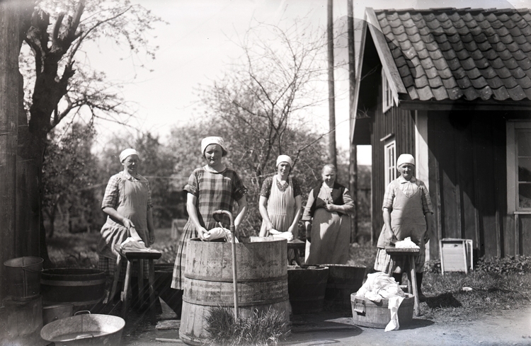 Från vänster Anna Staaf , vid tvättkaret jungfrun Cecilia o husmor Gustava Wennerholm,