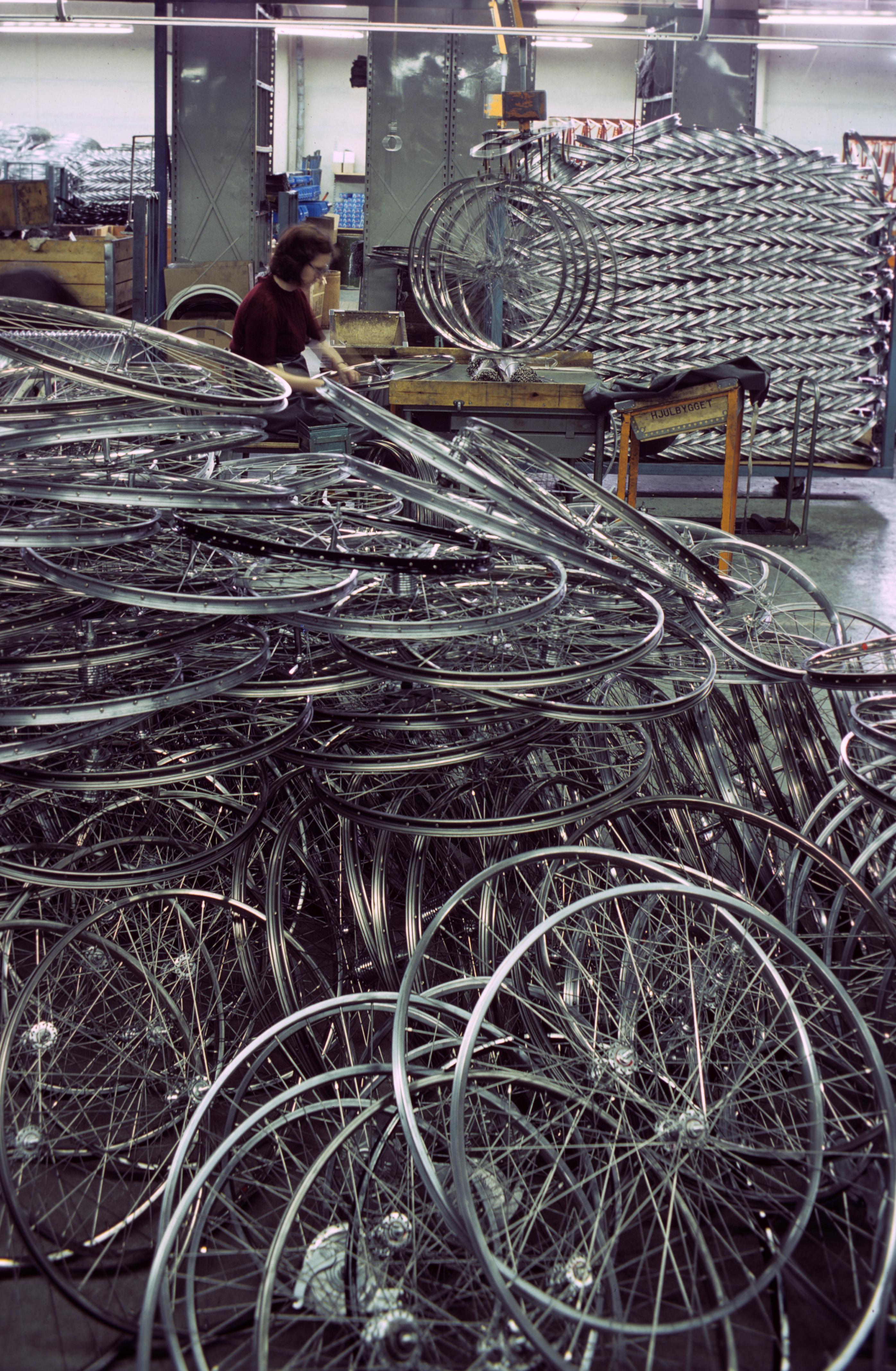 Tillverkning av cyklar. Bilden troligen från mitten av 1970-talet.