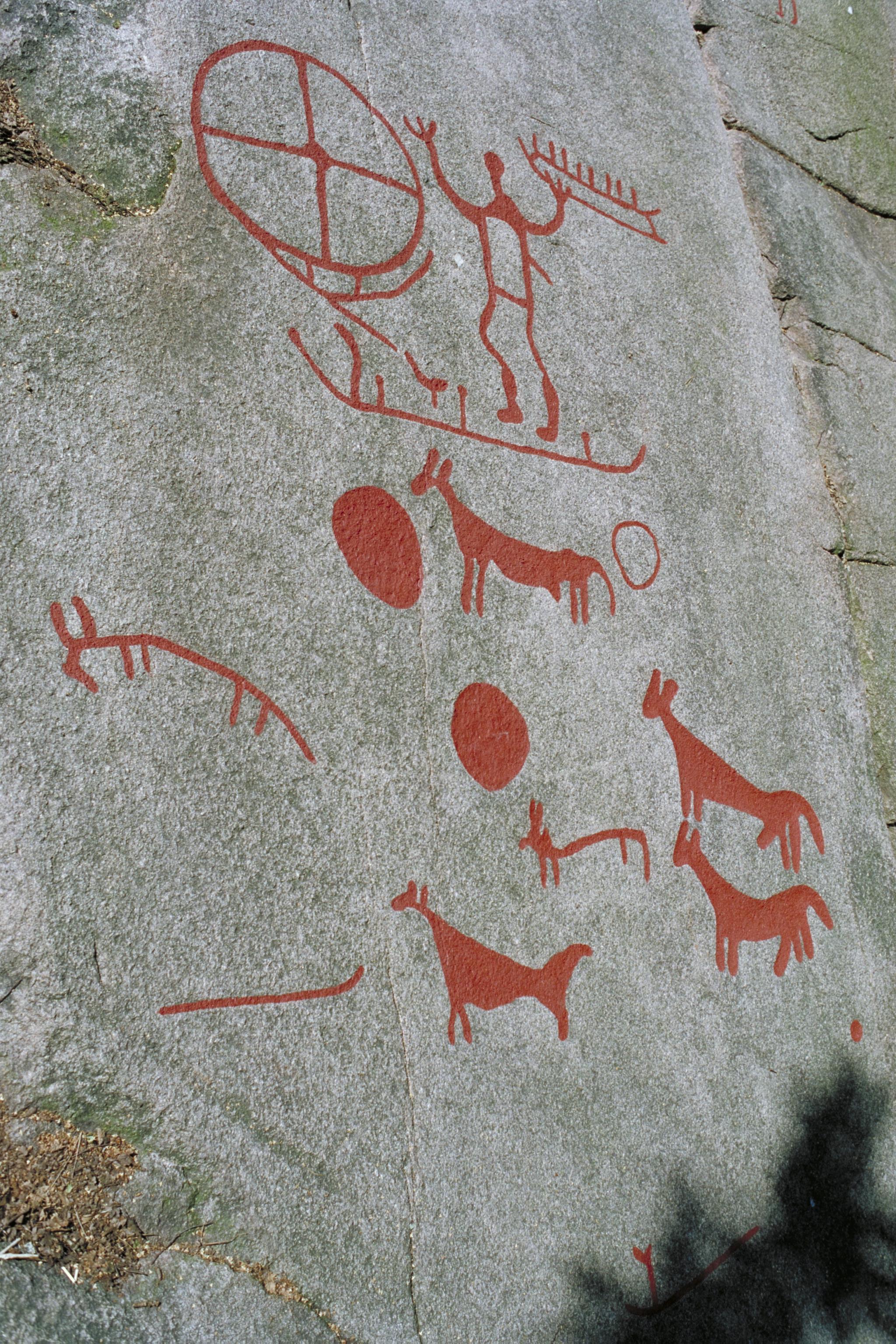 Djur, människofigur, hjulkors och skepp. Tossene 73:1.
