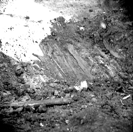 Rester av fyrsidigt skiftesverkskar i schaktets centrala del.