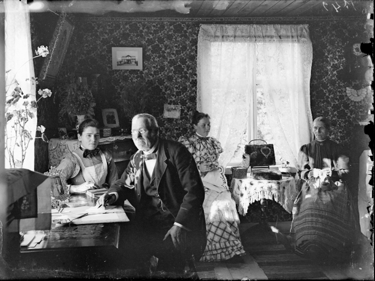 Tre handarbetande damer och en skrivande herre.